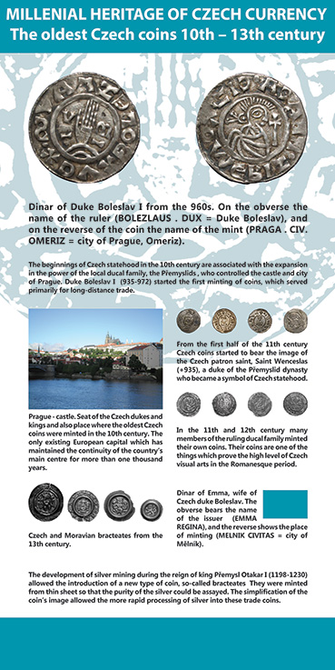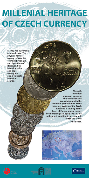 Dějiny české měny jsou v širším evropském kontextu představeny na 11 výstavních panelech fotografiemi a galvanoplastickými kopiemi vzácných historických mincí, které podle sbírkových originálů zhotovil restaurátor VČM Michal Vojtěchovský. Část je věnována současné české korunové měně, existující od roku 1993.